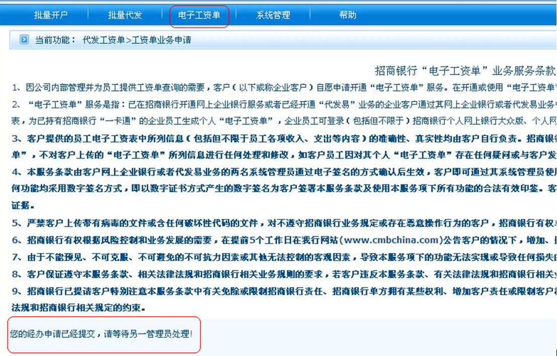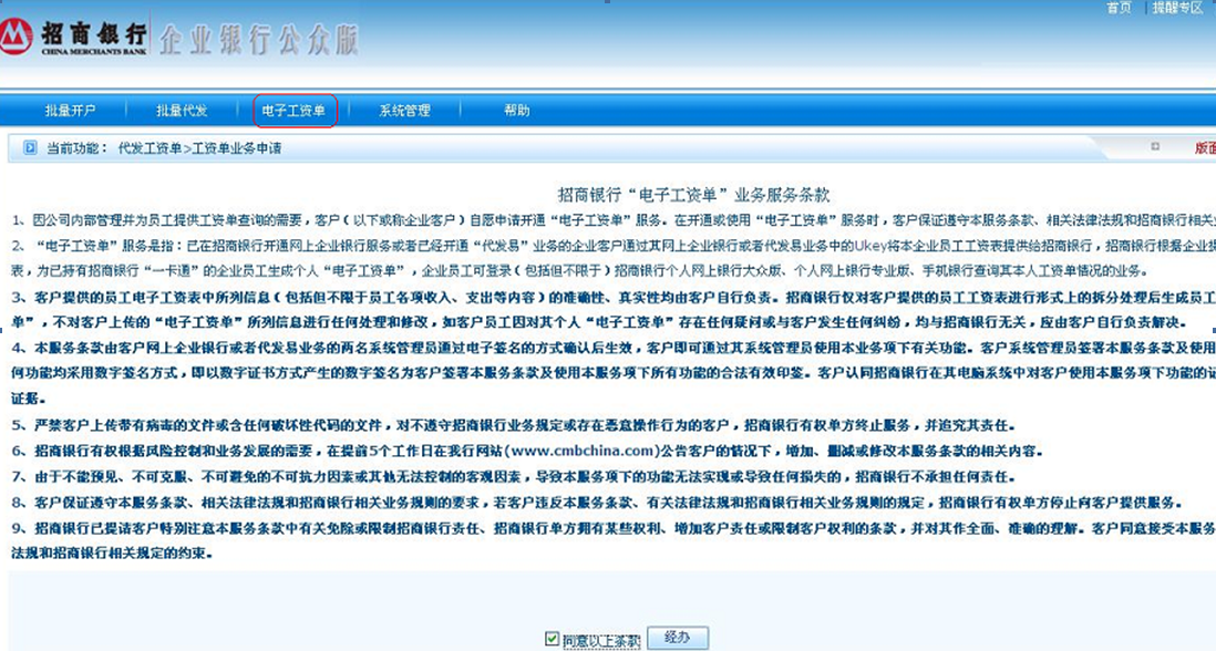 点击“电子工资单”菜单下的“工资单业务申请”按钮,显示《招商银行“电子工资单”业务服务条款》。如确定开通该功能,则选中“同意以上条款”复选框,点击“经办”按钮。系统将弹出确认/取消的对话框。管理员点击“确定”后,即完成“电子工资单”业务申请的经办步骤。