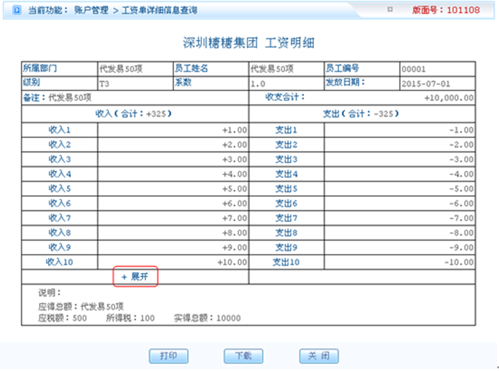收入或支出项超过10条,可点击“+展开”、“-收起”进行查询。