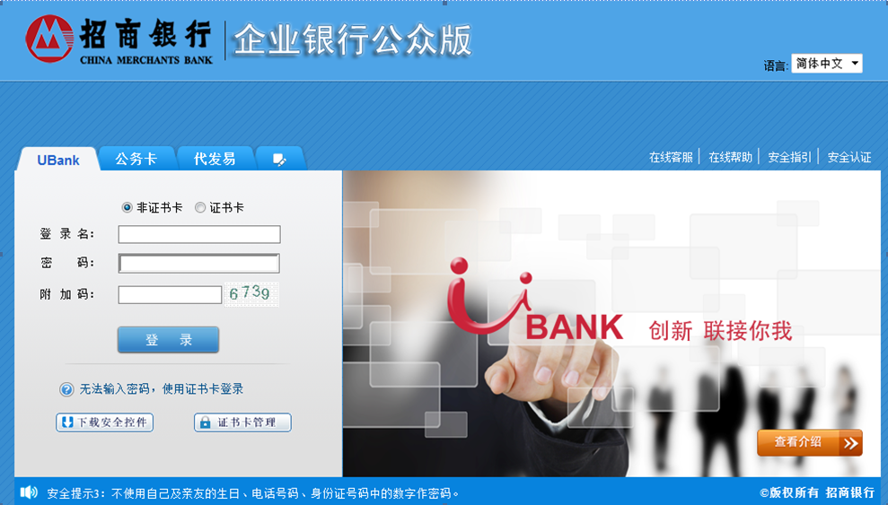 先行将U-KEY查入电脑,在IE上输入https://u.ebank.cmbchina.com/,进入招商银行企业银行公众版,正确登入“Ubank”或“代发易”。