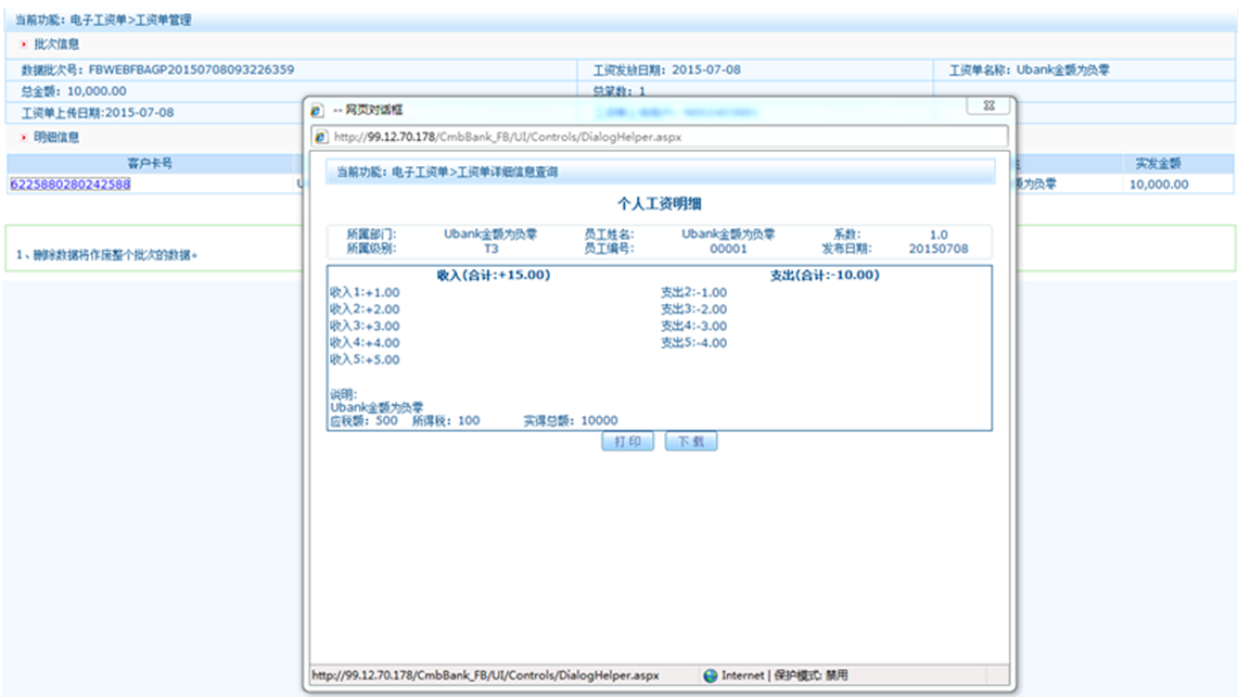 管理员输入或选择工资发放开始日期及截止日期,可以查询该时段内上传的工资单的简要合计项。选中并双击具体的一行记录,查看本批次上传工资单的列表信息,单击客户卡号可查看该员工工资单详情,并可以进行打印、下载操作。管理员可查看或删除此次上传的工资单。注意: