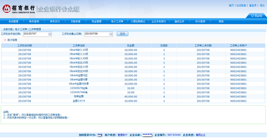 管理员登录企业网银公众版“Ubank”或“代发易”,点击“电子工资单”菜单下的“工资单管理”按钮,即可进入“工资单管理”的页面。