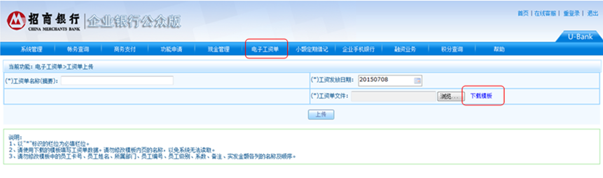 管理员登录企业网银公众版“Ubank”或“代发易”,点击“电子工资单”菜单下的“上传工资单”按钮,即可进入“上传工资单”的页面。