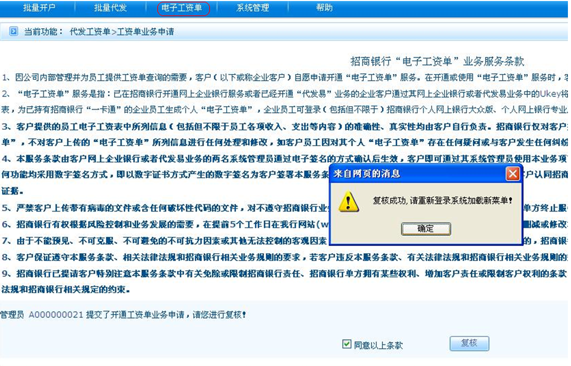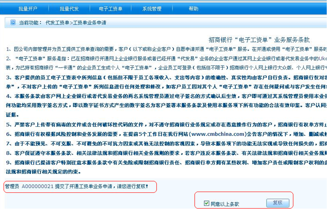 “Ubank”或“代发易”的另一管理员,按照上述步骤1登录,点击“电子工资单”菜单下的“工资单业务申请”按钮,在《招商银行“电子工资单”业务服务条款》下方显示“管理员XX提交了开通电子工资单业务申请,请您进行复核”。如同意,则选中“同意以上条款”,点击“复核”按钮,完成复核步骤,即可开通“电子工资单”功能。
