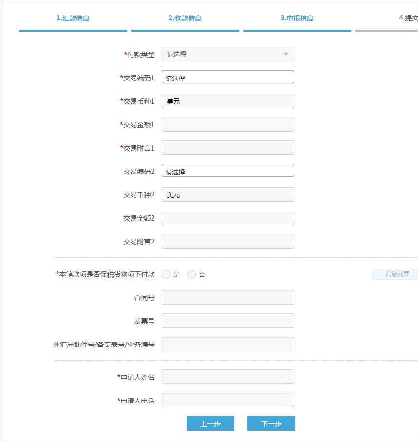 申报信息界面显示的填报信息栏均为国际收支申报统计要求的必填要素。请按照系统提示依次填入即可。
