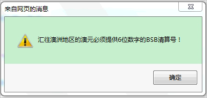 收款银行清算号栏位非必填,汇往澳洲地区的澳元汇款除外(必须录入6位BSB号),若未录入,界面展示以下报错。