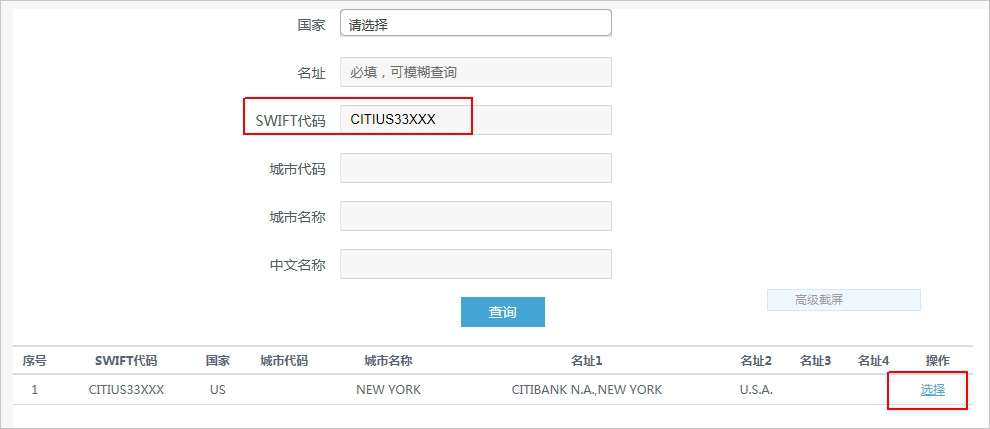 ③可使用搜索功能,录入收款行SWIFT代码,并调出收款行名址;