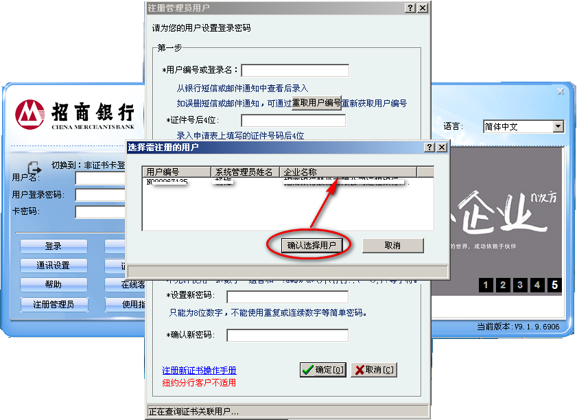当存在多个未注册管理员用户时,输入正确的证书密码后弹出选项框,选择需要注册的管理员。