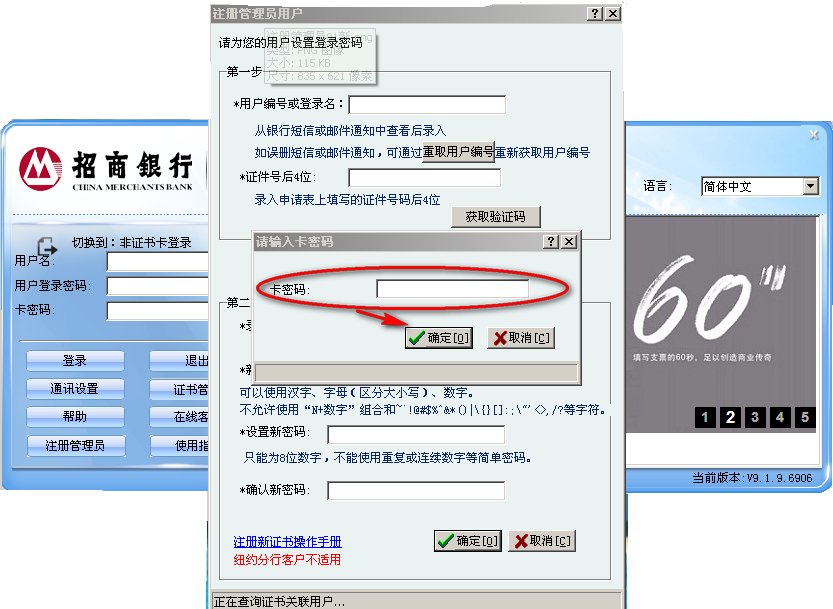 启动U-BANK并插入一个管理员的 UKey,在登录界面点击“注册管理员”,弹出输入证书密码页面(证书卡密码输入错误次数限制9次)。