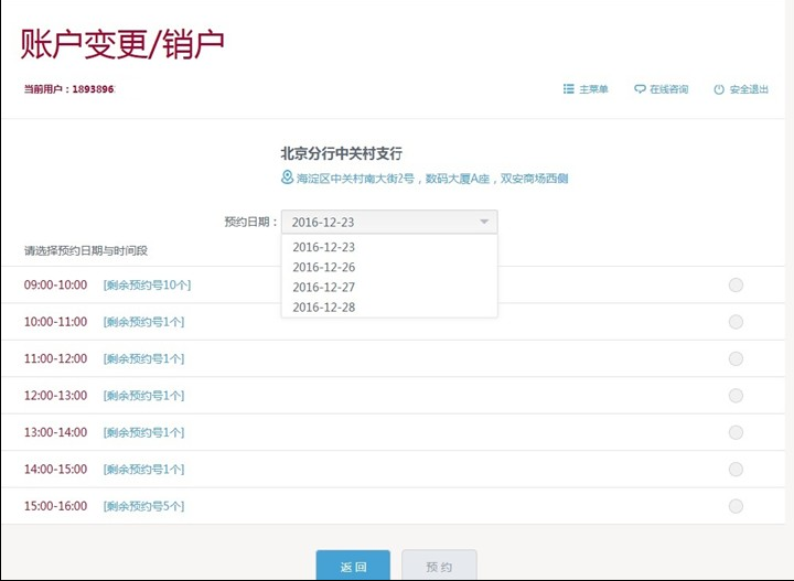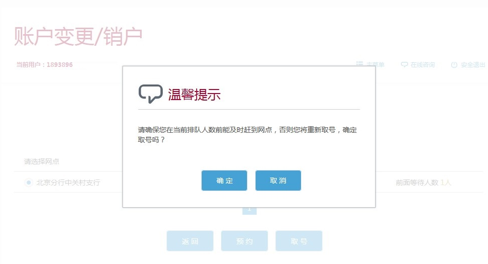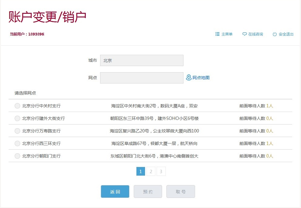 4、其它业务(账户变更、对公结算、存款、贷款\商业汇票、现金支取、现金存入、对公外汇),点击相应菜单栏后,选择欲前往的城市及网点,可根据需要选择“预约”(未来工作日办理)或“取号”(直接在线取号)。开户仅支持预约指定时间,不支持远程取号即时办理。截图以“账户变更\销户”为示例,其它业务操作方式相同。