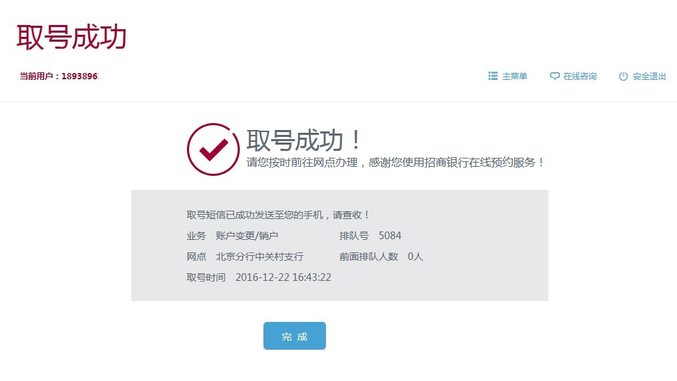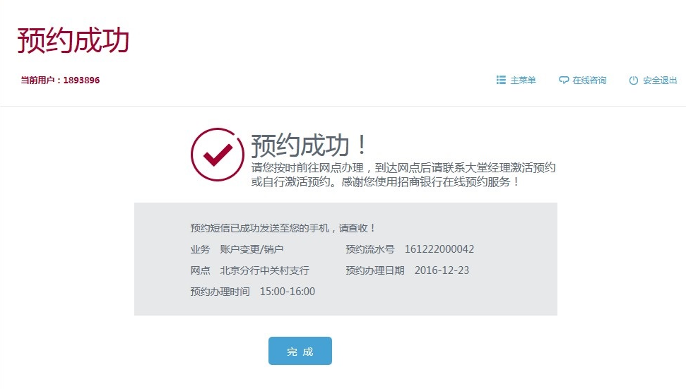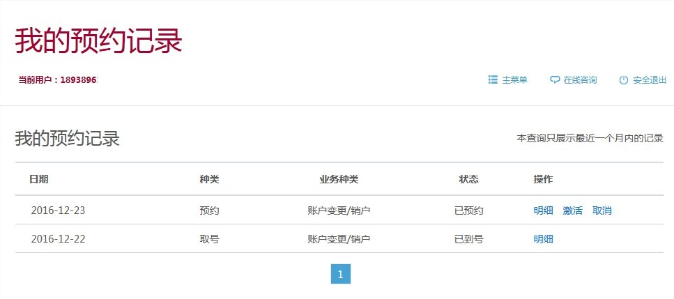 回到起始登陆页面,可以继续预约,或查看明细、“激活”、“取消”,在预约时点或前后半小时,可在本页面点击“激活”或在排队机激活预约(如为微信预约,可直接在微信的预约明细中点击“我到了”激活)。