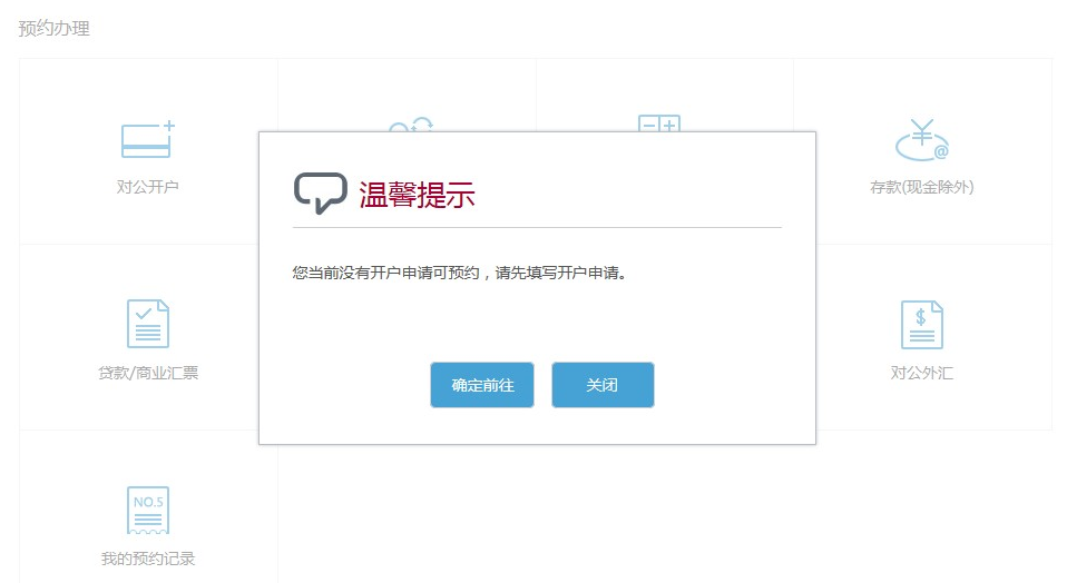 3、选择办理开户业务时,须先通过网上“开户易”填写开户申请后,方可进行预约。选择办理取现业务时,若取现金额达到大额取现标准(目前为5万),无法进行预约。