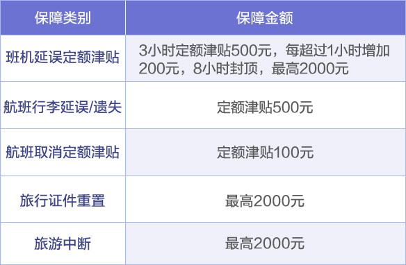 2保障内容:航班延误3小时及以上、行李丢失或延误、旅行证件丢失和旅游行程中断等
