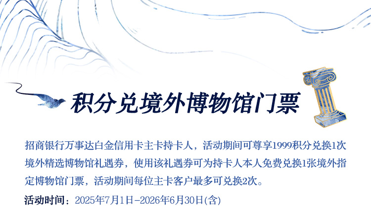 3每张礼遇券支持免费兑换1张境外精选博物馆1日标准成人门票(“境外精选博物馆”列表以本活动页面最新更新为准),门票仅限持卡人本人使用。客户活动期间最多可兑换2次博物馆礼遇券,即活动期内最多可为本人预订2张境外博物馆门票。