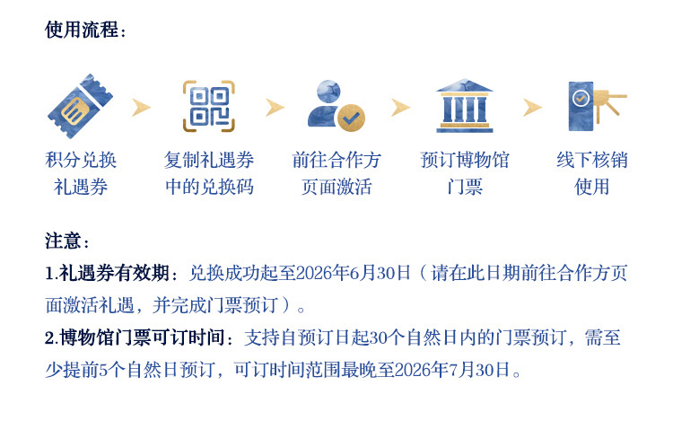 7请您至少提前5天进行预约,支持预订同一天的两家不同博物馆门票,具体预约安排以预约商户的实际情况为准,参与兑换的博物馆名录和服务内容以预约渠道最新公布为准。