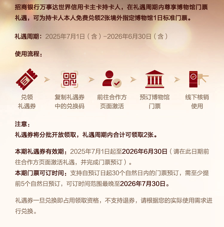 4本活动所赠的境外博物馆礼遇券仅限于指定渠道兑换境外精选博物馆成人1日标准门票。客户于掌上生活App成功领取兑换券后,可通过微信“龙腾出行”公众号-输入关键词“招行万事达卡礼遇(或点击菜单按钮“使用权益”-“招行万事达卡礼遇”)进入“招行万事达卡礼遇兑换专区”-根据提示进入境外博物馆礼遇券激活页面,根据页面提示激活礼遇券并预订境外博物馆门票。