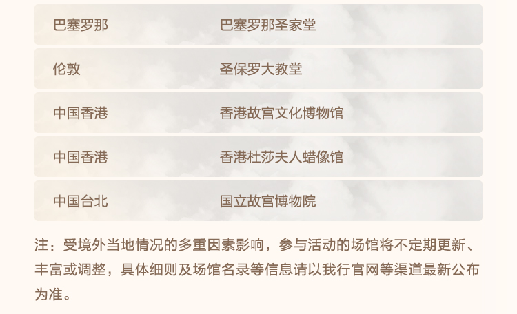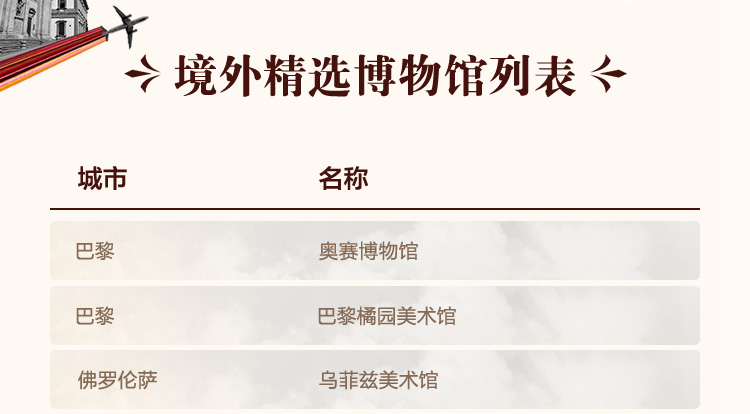 7支持自预订日起30个自然日内的门票预订,请您至少提前5天进行预约,支持预订同一天的两家不同博物馆门票,具体预约安排以预约商户的实际情况为准,参与兑换的境外精选博物馆名录和服务内容以预约渠道最新公布为准。