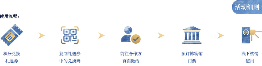4本活动所赠的境外博物馆礼遇券仅限于指定渠道兑换境外精选博物馆成人1日标准门票。客户于掌上生活App成功领取兑换券后,可通过微信“龙腾出行”公众号-输入关键词“招行万事达卡礼遇(或点击菜单按钮“使用权益”-“招行万事达卡礼遇”)进入“招行万事达卡礼遇兑换专区”-根据提示进入境外博物馆礼遇券激活页面,根据页面提示激活礼遇券并预订境外博物馆门票。
