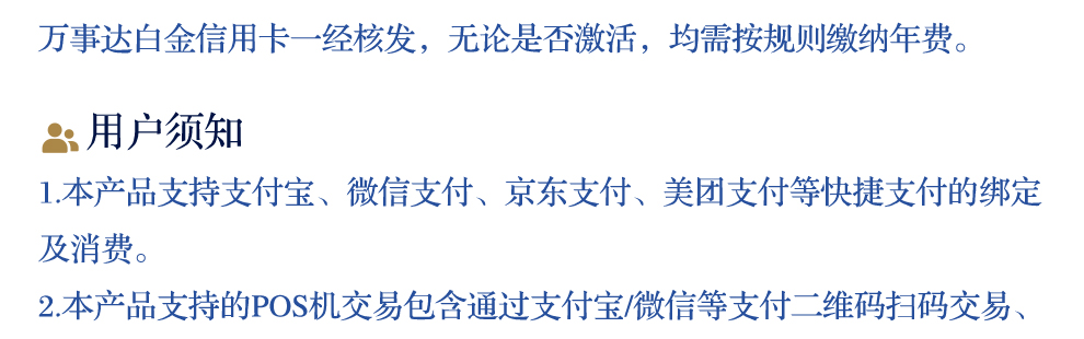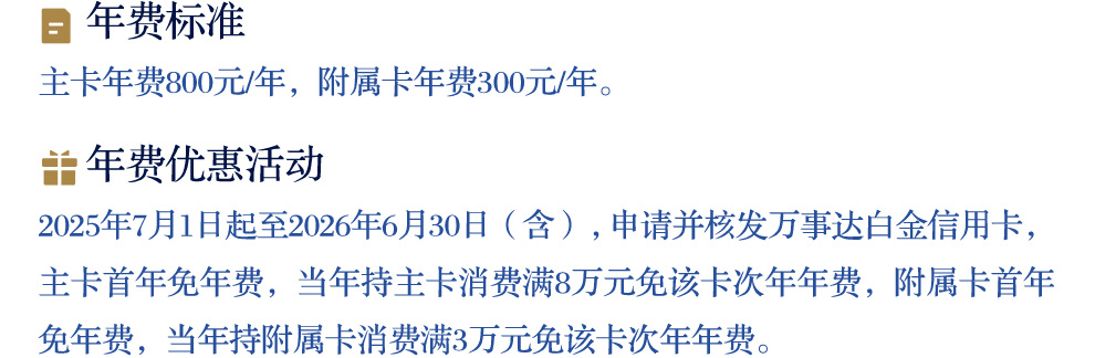 主卡年费800元/年,附属卡年费300元/年年费优惠活动:2025年7月1日-2026年6月30日(含),申请并核发万事达白金信用卡,主卡首年免年费,当年持主卡消费满8万元免该卡次年年费,附属卡首年免年费,当年持附属卡消费满3万元免该卡次年年费