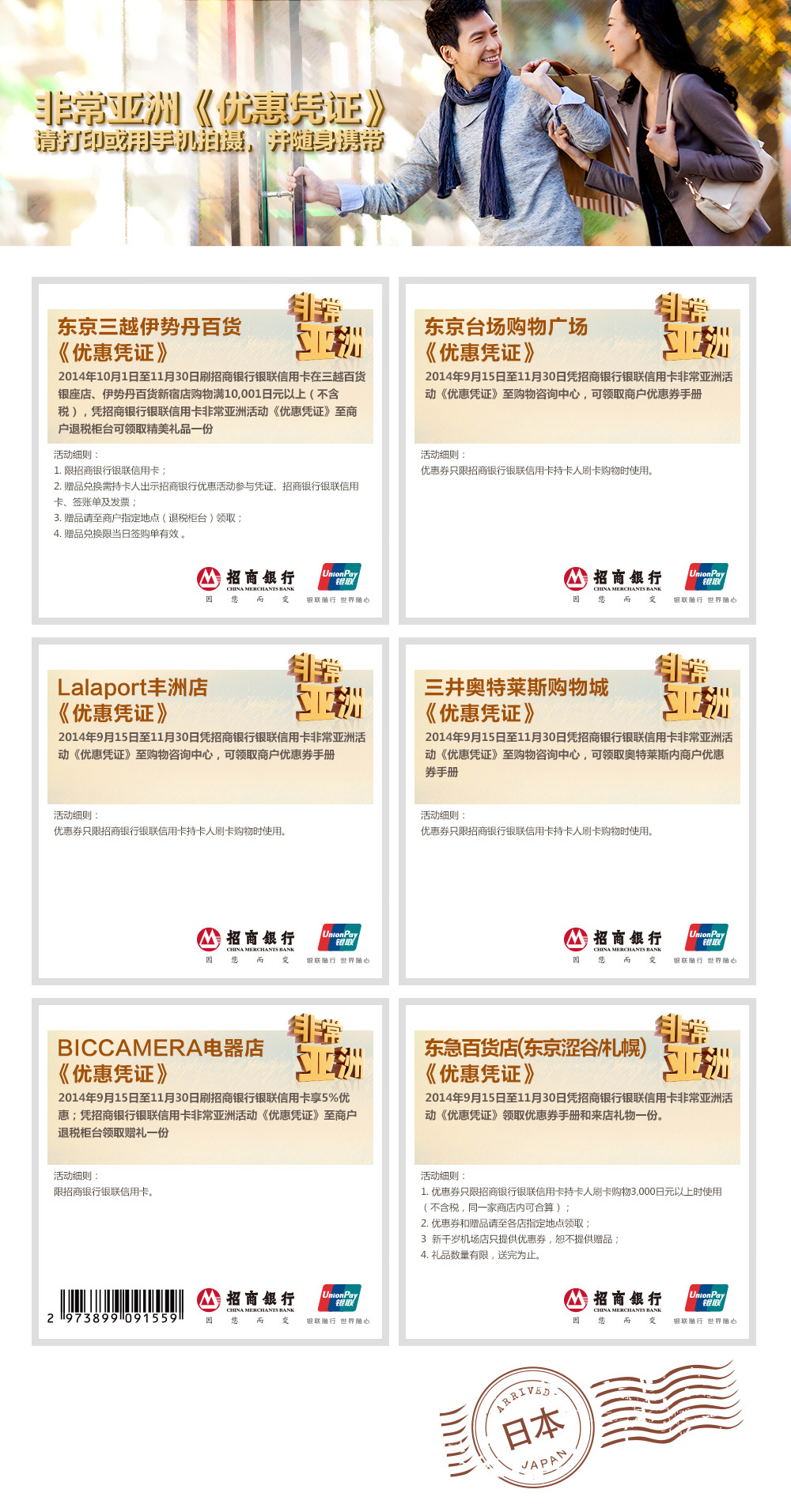 2014年9月15日至11月30日凭招商银行银联信用卡在东急百货本店(涩谷)、东横店、HIKARIE ShinQs店、札幌店和新千岁机场店可领取来店礼物和优惠券(优惠券只限购物满3000日元(不含税)时使用)