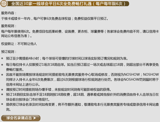 全国近30家一流球会周一至周五 "1000积分"兑换果岭费礼遇(每户每年12次)