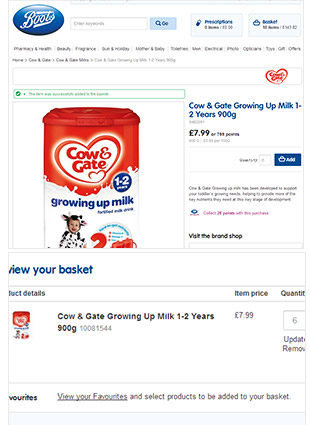 没办法我只好放弃tesco,改注册boots,(怎么填写地址,华盟家都有教程。)顺顺利利的注册完毕,就开始选奶粉啦!选择好数量加入购物车然后check out。