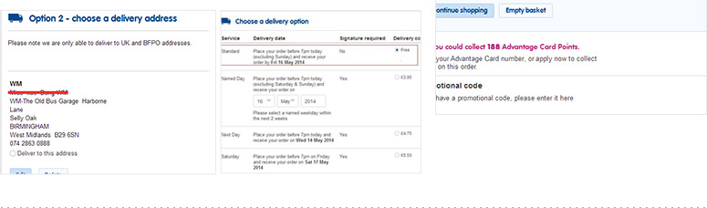 选择已经注册好的邮寄地址,comfirm address(确定地址)。boots家是满70磅免运费。结果到后一步就不顺利,没有进入结账却出现了一下提示
