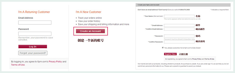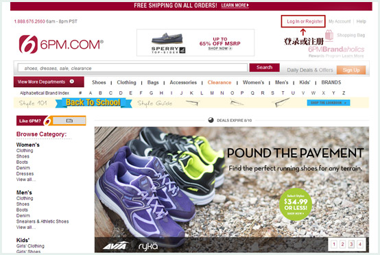 海购开始。你首先要做的是——恩,打开网址——http://www.6pm.com。点击右上角的Log in or Register注册或者直接登录。