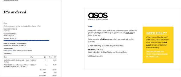 付款成功后,ASOS立马给我发了个订单成功的邮件。隔了一天又收到发货邮件,真是super fast!(话说老外的邮件说话方式真让人愉悦舒服~感觉时时刻刻为你着想似的^ ^)