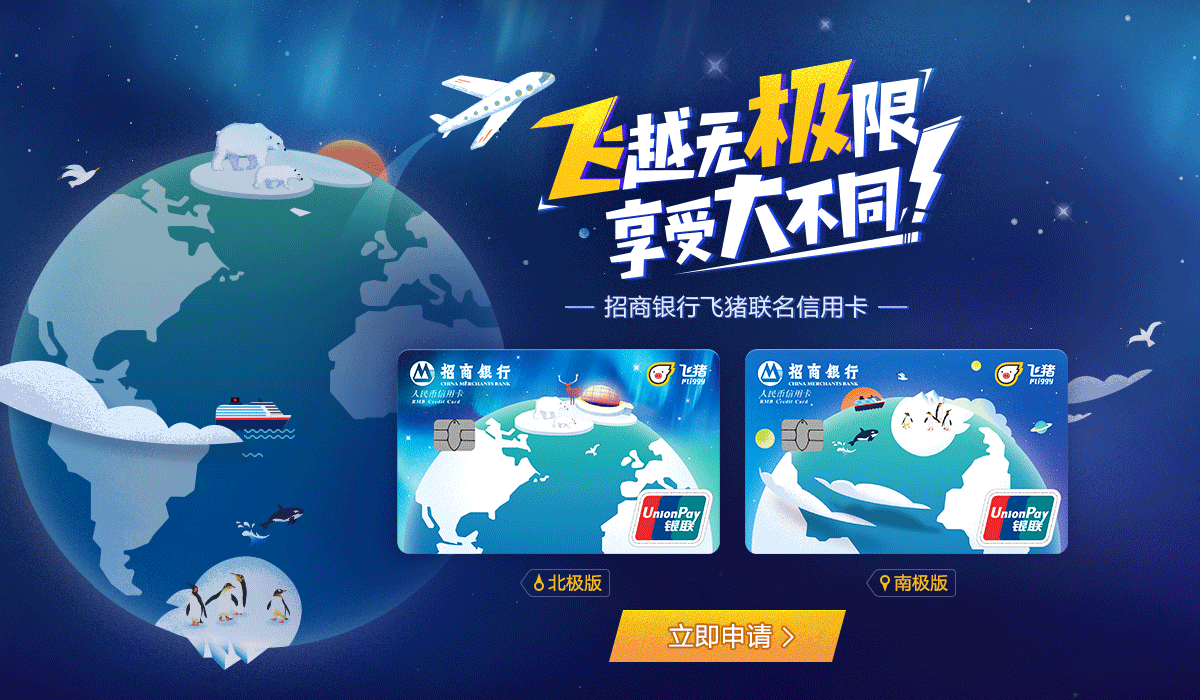 2019年5月9日起至2020年3月31日(含),凡申请并成功核发飞猪联名卡的新户主卡持卡人,在卡片核发后次两个自然月内,满足以下任一条件,即可通过招商银行掌上生活App领取:价值888元ELLE HOMME 20寸旅行箱一个或1000招商银行信用卡积分。通过飞猪APP申请的客户可额外获赠1000飞猪里程