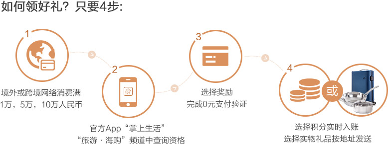 4.本活动无需报名,持卡人在活动期间在境外累计消费满人民币10,000元,50,000元和100,000元,消费入账达标后即可于掌上生活App领取相应积分或实物礼品,领取成功后,在60分钟内需务必完成0元0积分验证支付。本次活动每档消费达标可同享,每档限领取一次,每户最多领取3次奖励。第三档积分奖励和实物礼品三选其一,不可兼得。持卡人达标交易入账的3个工作日后,资格将生效。客户可通过掌上生活本活动页面查询资格达标情况。