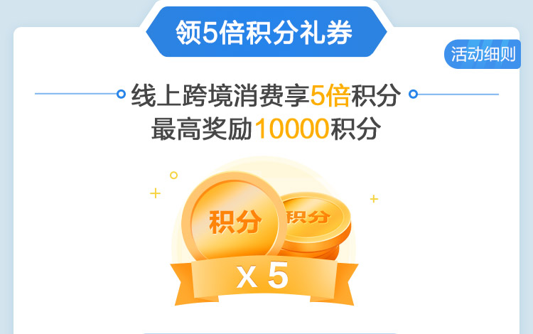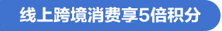 持卡人成功领取境外线上5倍积分礼券,活动期间在境外线上商户使用招商银行个人信用卡消费,即可享5倍积分回馈,活动期间每户最高可享10000奖励积分。
