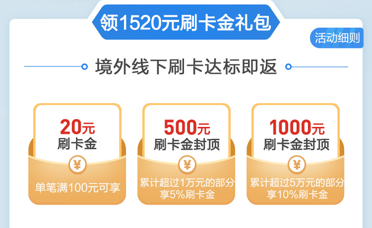 c.最高1000元刷卡金:1份“10%刷卡金”(累计达标消费超过50000元人民币以上的部分可享,封顶奖励1000元人民币刷卡金)