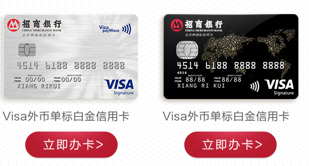 Visa外币单标卡系列Visa外币单标卡包括:Visa外币单标白金信用卡、Visa外币单标国际信用卡、Visa外币单标联名卡等所有招商银行Visa外币单标国际信用卡