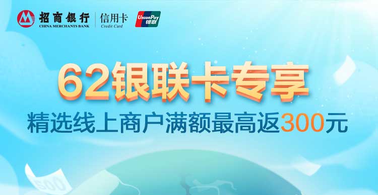 招商银行银联个人信用卡(卡号以62开头)持卡人通过指定页面成功报名当日起,在境外线上精选商户使用已报名成功的卡片,通过银联线路累计消费每满1万元人民币,享100元人民币返现。单卡活动期内最高返300元,若活动期间内发生退货交易导致交易不达标的,则无法获得对应返现奖励。