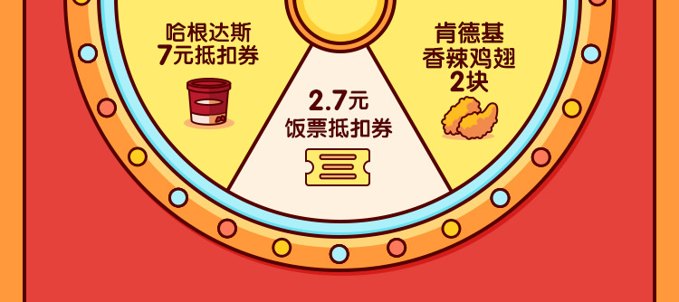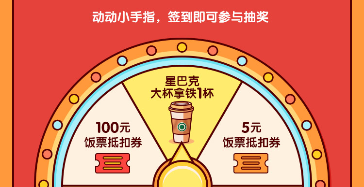 您可能抽取到星巴克大杯拿铁1杯、100元饭票通用抵扣券1张、肯德基香辣鸡翅2块、5元饭票通用抵扣券1张、2.7元饭票通用抵扣券1张、哈根达斯7元抵扣券1张,百分百中奖,赶紧来参与吧!
