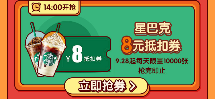 点击活动页面上的“立即抢券”就可以直达抢兑活动了,抵扣券适用于在掌上生活购买星巴克饮品券时使用,抵扣券自10月1日至10月7日有效。抢到后您可以在“掌上生活-饭票-我的-抵扣券”进行查看具体使用规则并使用。