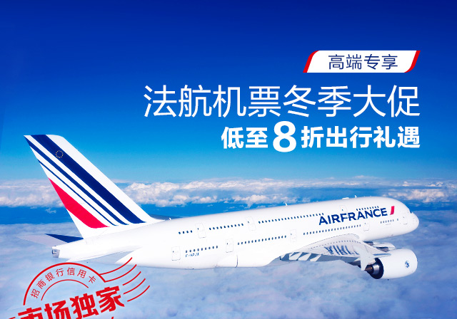 2017年12月5日 - 2018年2月5日,招商银行高端信用卡联合法国航空,为高端信用卡(白金分期卡除外)主卡持卡人独家奉上法航三种舱位机票大促,最低可享8折出行优惠!从中国大陆出发,无论是商务舱、尊尚经济舱,或是经济舱,让舒适、精致与自在的独特体验,始终伴随您的空中旅程。