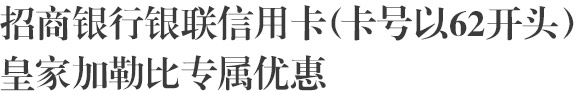 通过皇家加勒比游轮官网、或官方微信、或在宾客服务台,使用招商银行银联信用卡(卡号以62开头)成功绑定船卡,同时在宾客服务台登记优惠名额,即享: