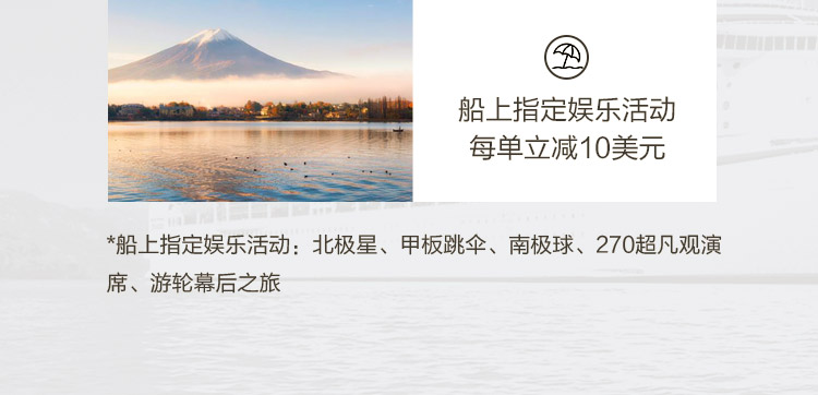 3.船上指定娱乐活动(北极星、甲板跳伞、南极 球、270超凡观演席、游轮幕后之旅)每单立减10美元
