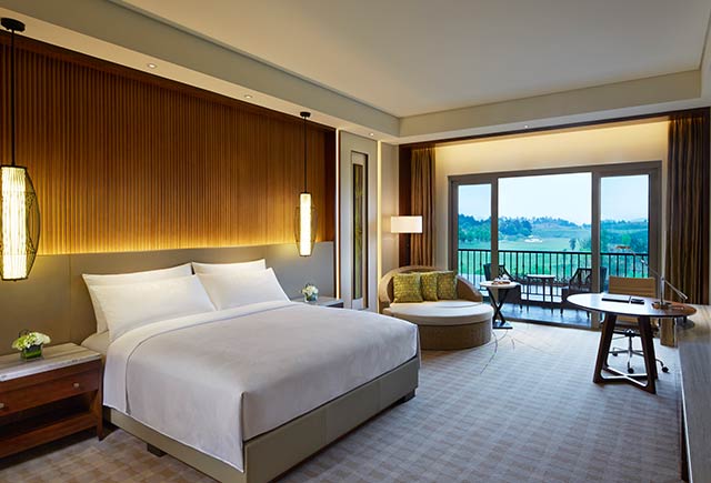 酒店位于重庆市北部新区保利高尔夫球场,透过落地窗可饱览蜿蜒迂回的山体,山峰眏衬吊脚楼式的别墅,站在私人阳台里可远眺36洞高尔夫球场绿地连绵。