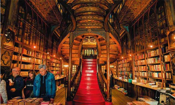 错综的墙壁、华丽的立柱、楼梯上精美的雕刻,以及彩色玻璃窗上的细腻图案, 店内的新派艺术区域的装修极具特色。除了葡萄牙语图书之外, 店内还有大量英文、法文书籍。书店中央有一个漂亮的大型歌德式木制螺旋楼梯, 一直通到楼顶,被誉为“天堂之梯”。人们可以透过透明天窗,360度仰望天空, 天窗上面还写有书店创始人JoséLello的格言。这一切,都让Livraria Lello显得如同教堂般肃穆庄重。 然而它更为令人着迷的身份则是——《哈利·波特》的灵感诞生地!