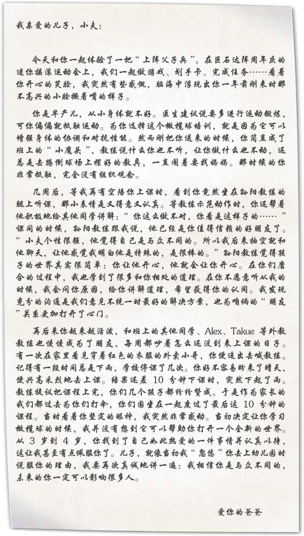 对于孩子来说,橄榄球运动可以为他带来什么?强身健体、团队意识、与人相处、人格塑造? 可能还有你远远想不到的改变。来看看一位父亲写给儿子的一封信: