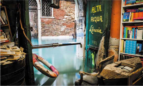 美丽的水城以河为路,书店后门是一个运河交通船的停靠站。每年涨潮之际, 店内这些随水上浮的舟艇便是书籍们的理想安放之地。偶尔洪水来袭,老板就得穿上橡胶雨鞋, 将书挪到高书架上。