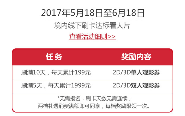 2017年5月18日至2017年6月18日(含)期间,使用招商银行个人信用卡,完成境内线下刷卡任务,即可至掌上生活App领取2D/3D观影券。