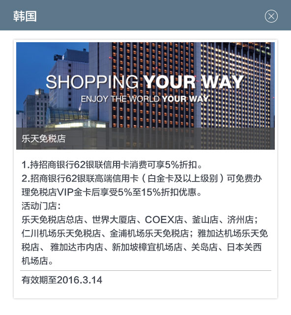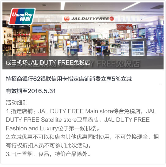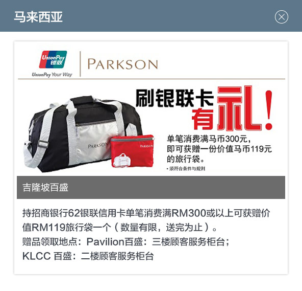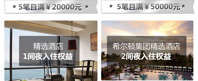 2015年12月1日至2016年3月31日,活动期间持指定招商银行银联单币信用卡在境外刷卡消费达标,最高可获得2间夜精选酒店入住权益。
