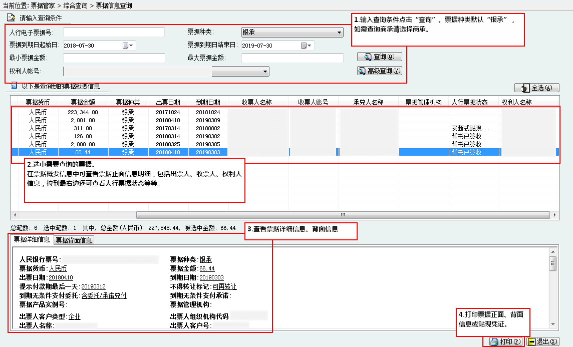 票据信息查询功能主要用于查询企业持有的电子票据,可通过该界面查询票据正面、背面信息,人行票据状态等。