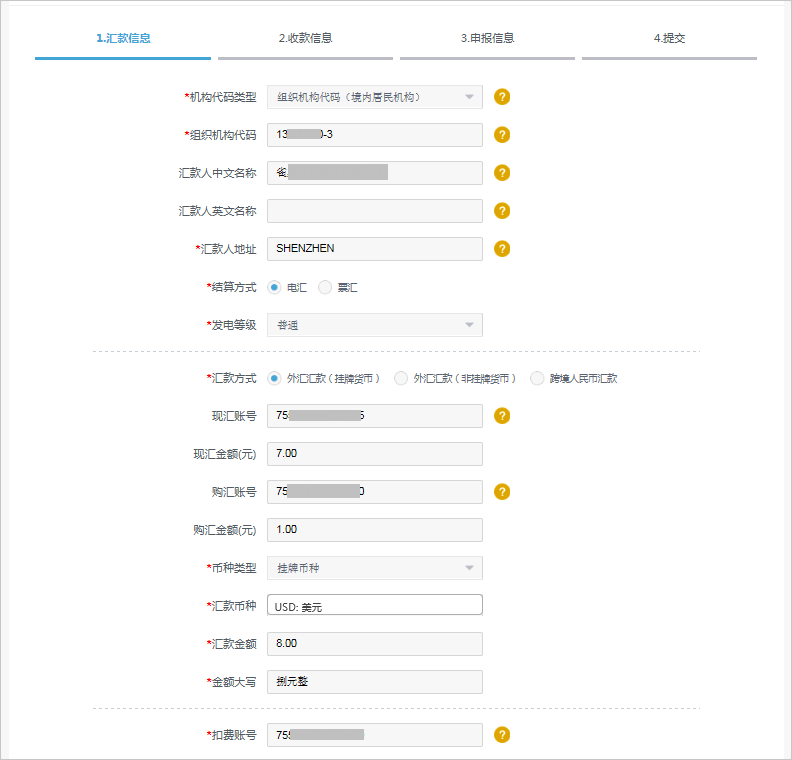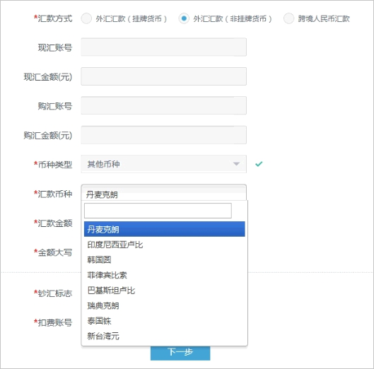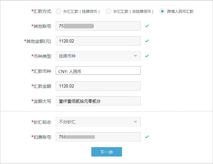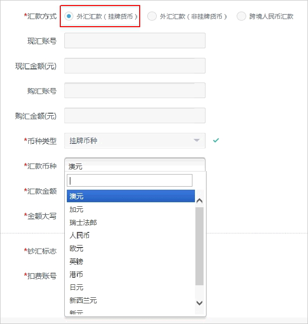 1)现汇账号/购汇账号/其他账号/扣费账号是否存在;