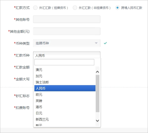通过SWIFT搜索功能检索选择SWIFT代码的,界面自动显示SWIFT码对应的银行名称和城市信息,并自动填充到“收款人开户银行名称地址”栏。该栏位被填充内容后仍可进行手工修改。其中日元、加元汇款,须填写收款行详细地址。
