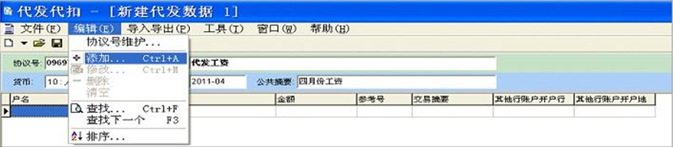 6、若您事先没有做好Excel表格,也可直接点击编辑,然后点添加,逐个录入数据。(*号为必填,如为他行客户开户行及开户地也必须填写)“交易摘要”个人客户可通过专业版或大众版查询。