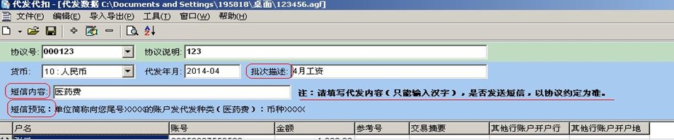 4、 协议密钥维护好之后,点击此处就能选择到,再将代发年月,公共摘要\批次描述填写好即可(公共摘要\批次描述一般可填写“X月代发工资”等)。
